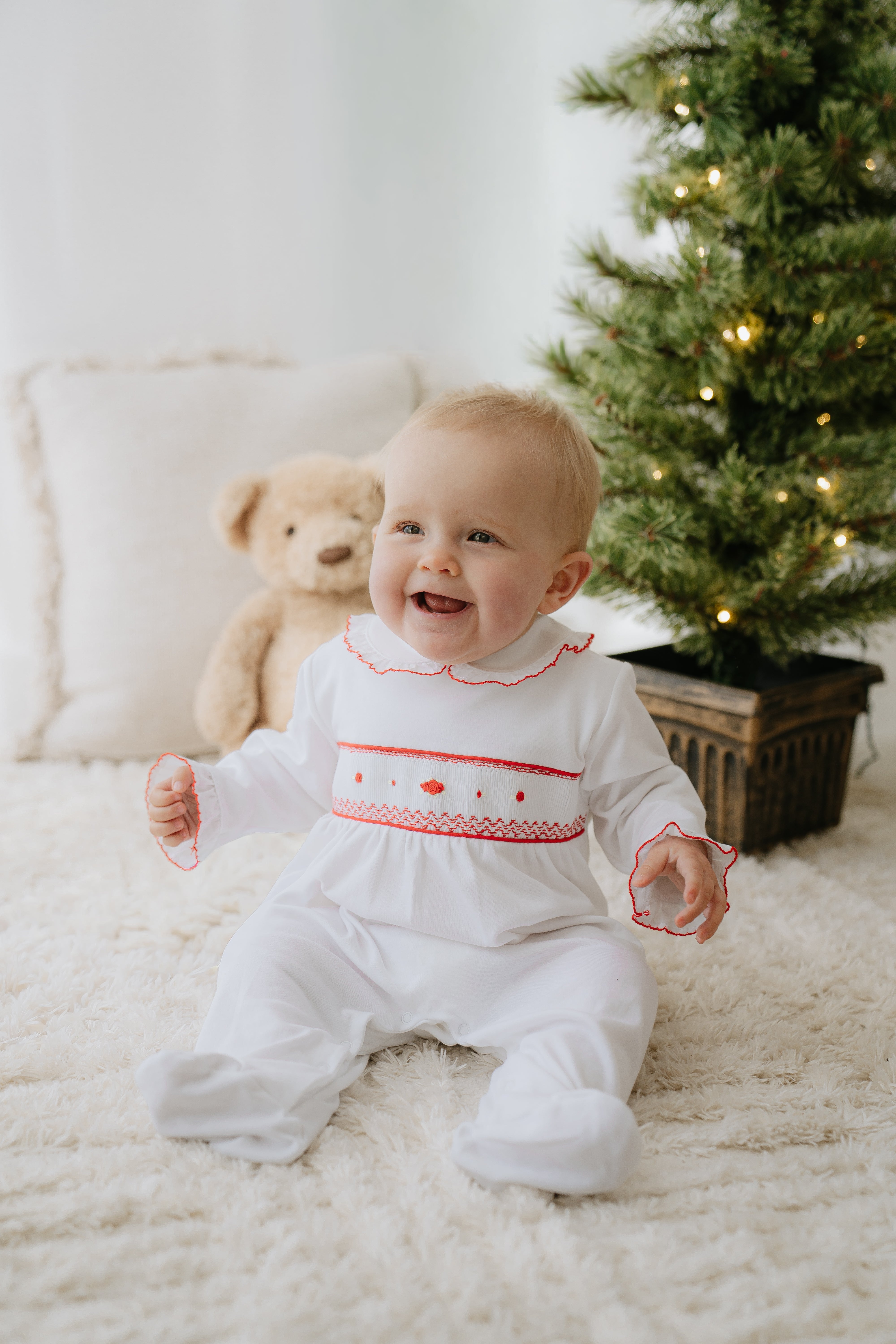 This chic sleepsuit in our soft Pima cotton is a lovely garment for your baby girl. Complete with rose buds embroidered on the smocked panel and a neat frill collar. A delightful piece. Fastens with poppers at the back of the neck and between the legs.