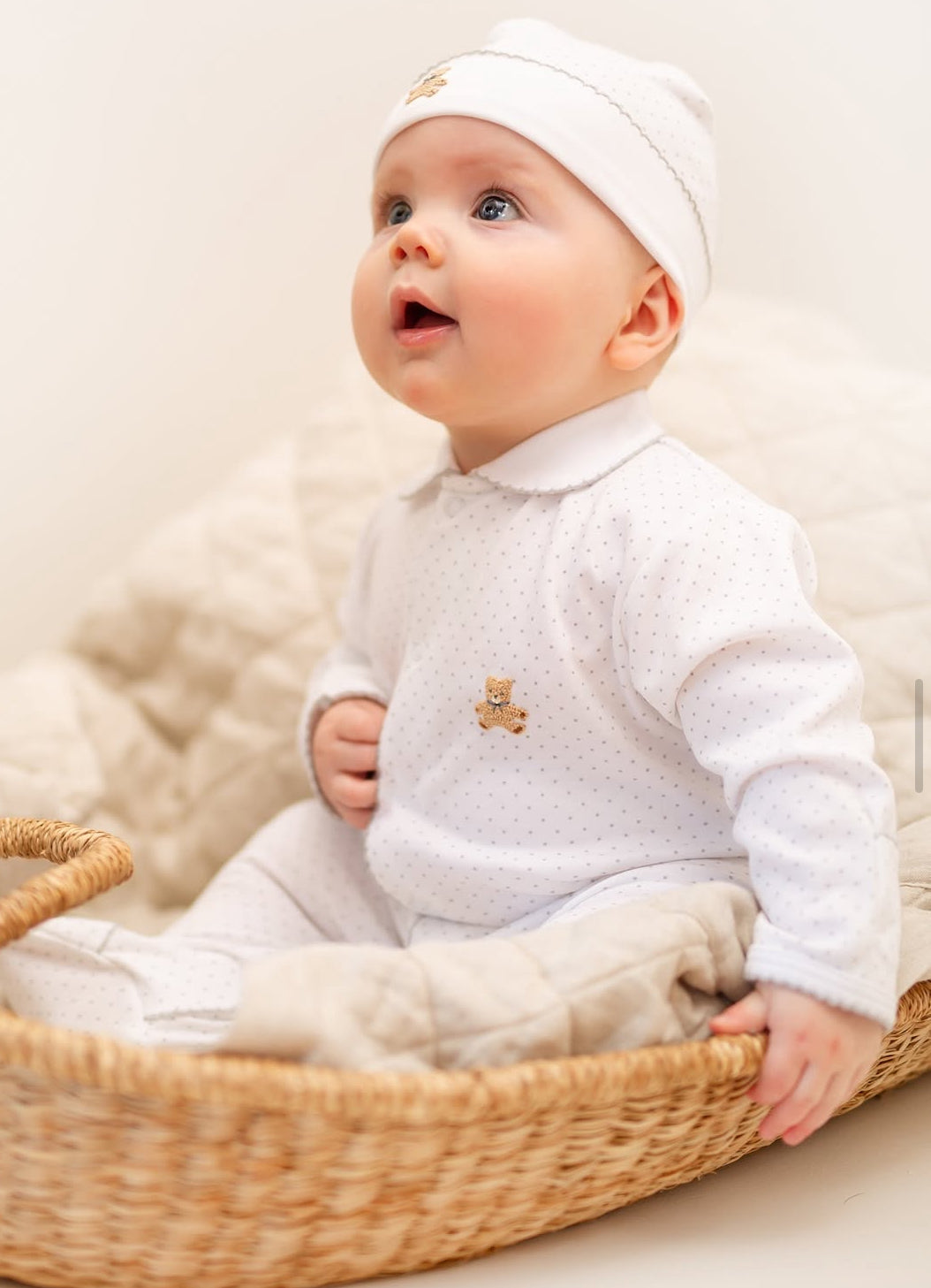 For your new born, this is a lovely footsie in soft cotton with its cute hand embroidered nursery bears. This is a delightful piece featuring integral scratch mitts. Fastens with poppers at the back of the neck and between the legs.