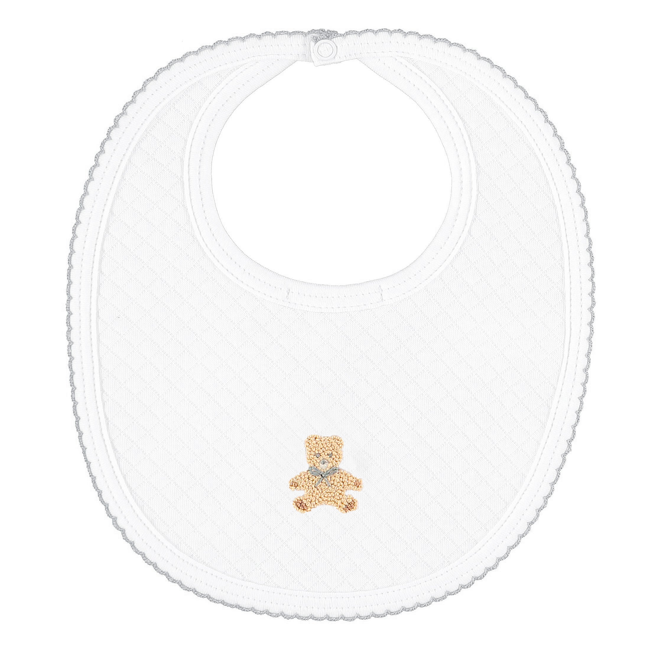 A smart quilted bib with a cute embroidered nursery bear. The perfect accessory to any of our babygrows. All our bibs are backed with soft absorbant towelling and close with a popper at the back of the neck. Suitable for NB to 9m.