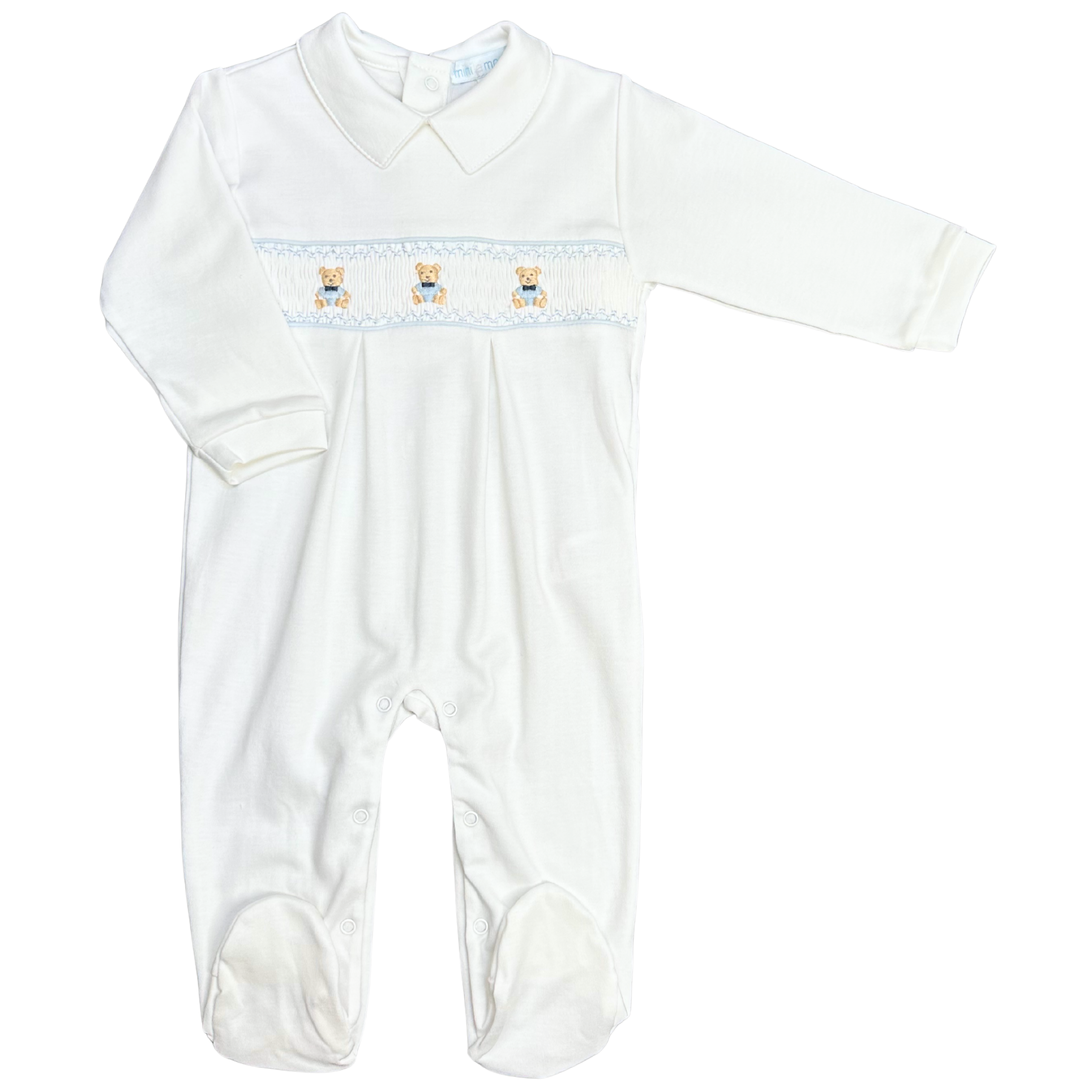 Super soft smocked footsie on cute blue polka-dot pima cotton or White pima cotton with blue detailing, with three adorable hand embroidered teddy bears, each one complete with a smart bow tie. Opens at the back with poppers and between the legs.