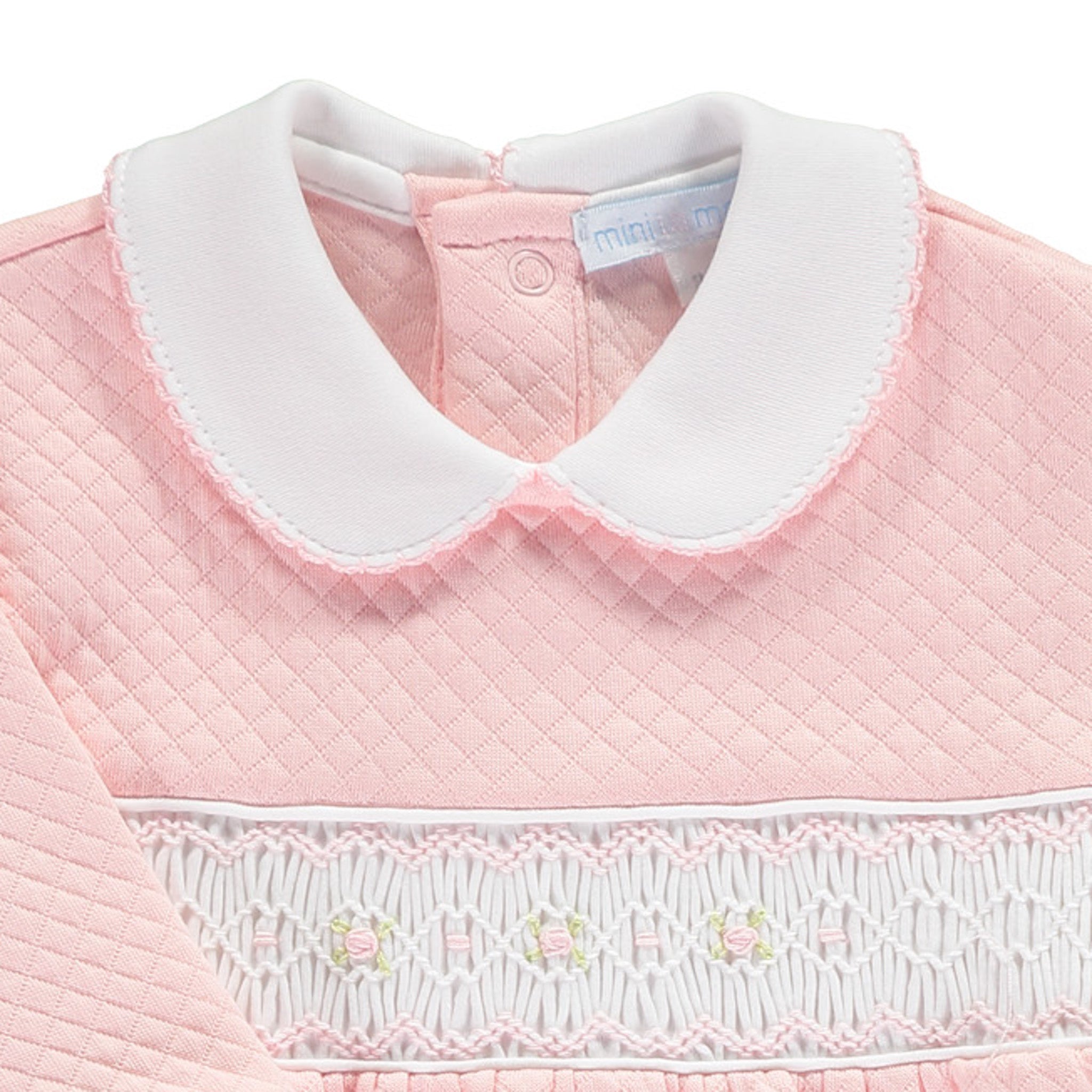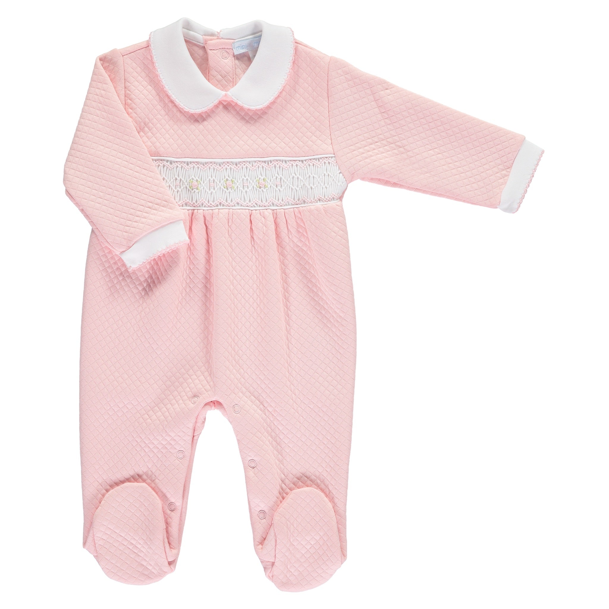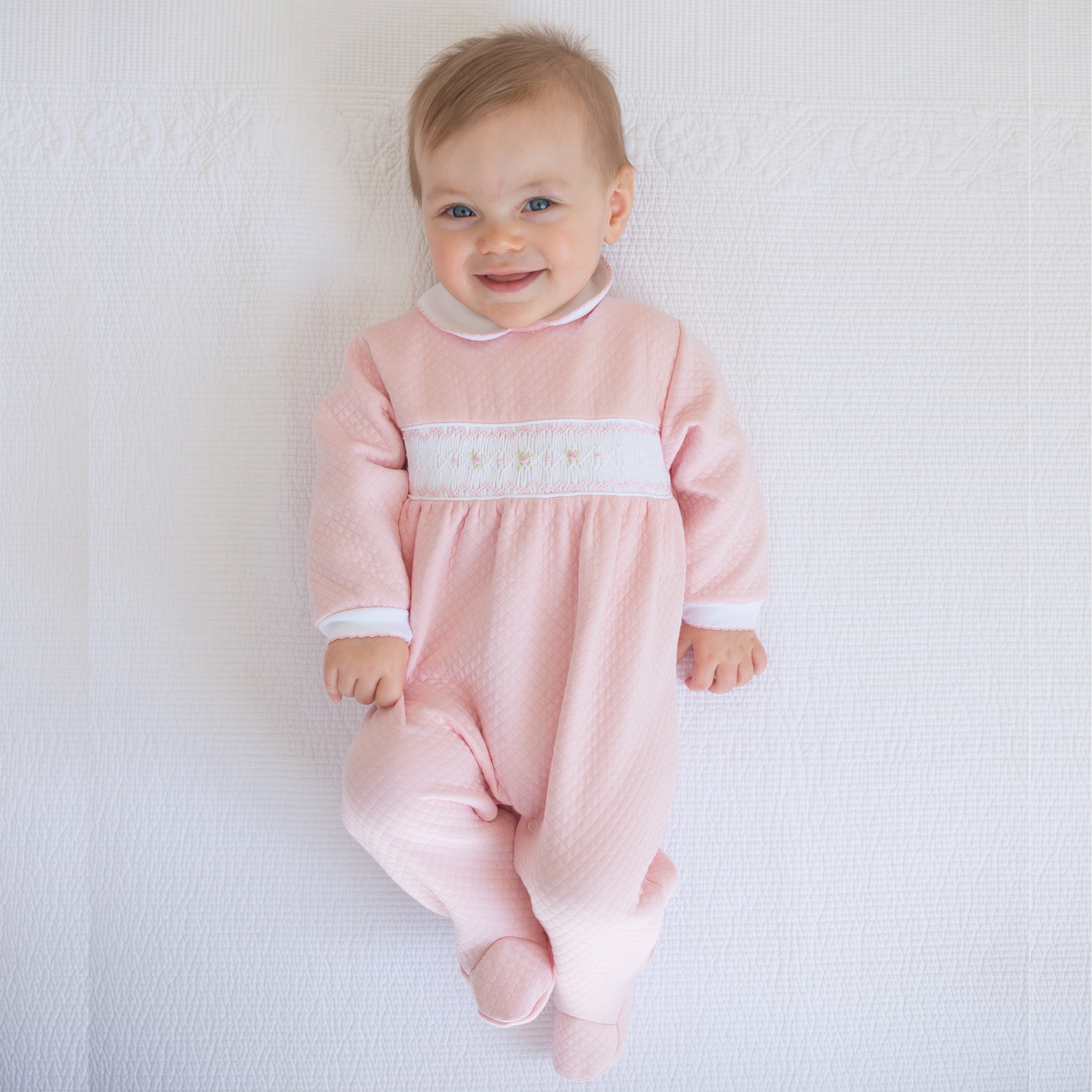 In our luxurious quilted Pima cotton fabric, this classic hand smocked sleepsuit makes the perfect outfit for your baby girl. Available in either white or pink with delicate baby pink rose smocking detail on the chest panel. This style is most definitely an heirloom piece. Opens at the back neck with poppers and between the legs.