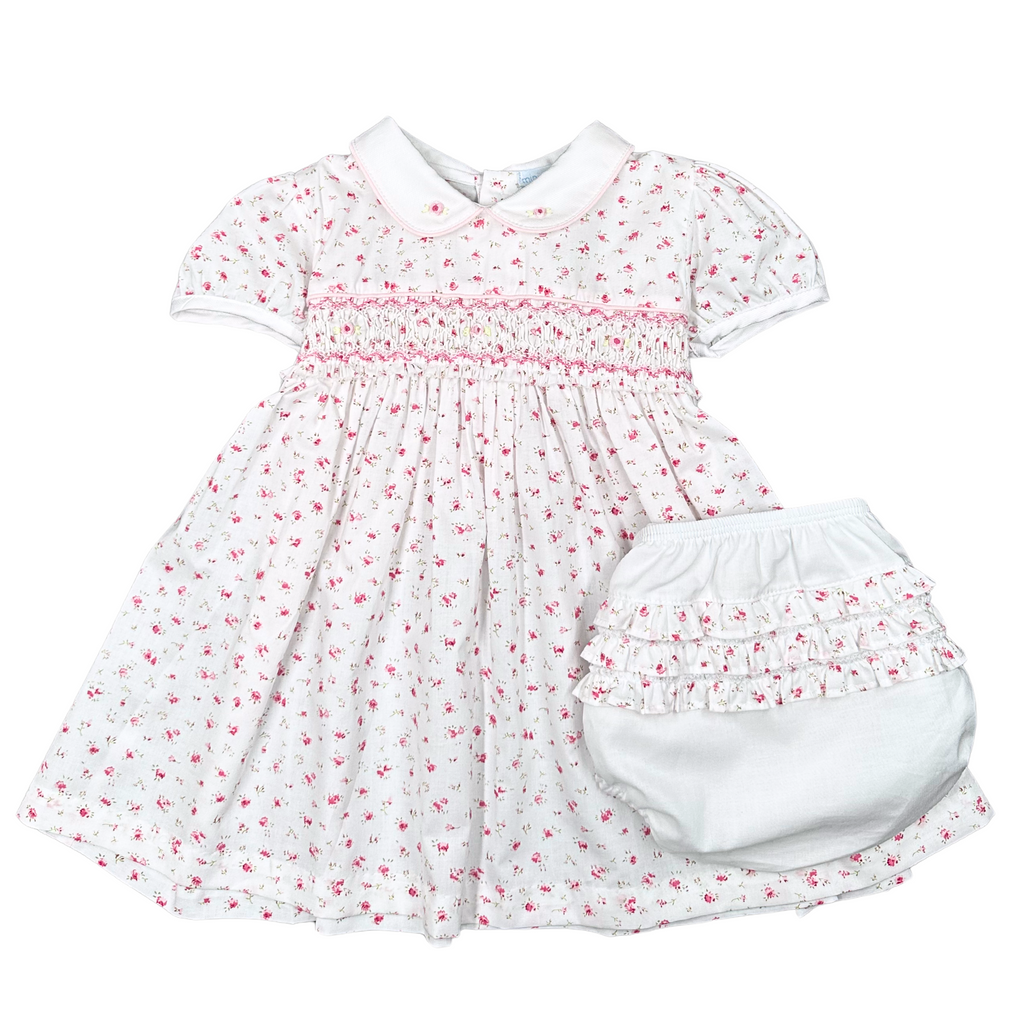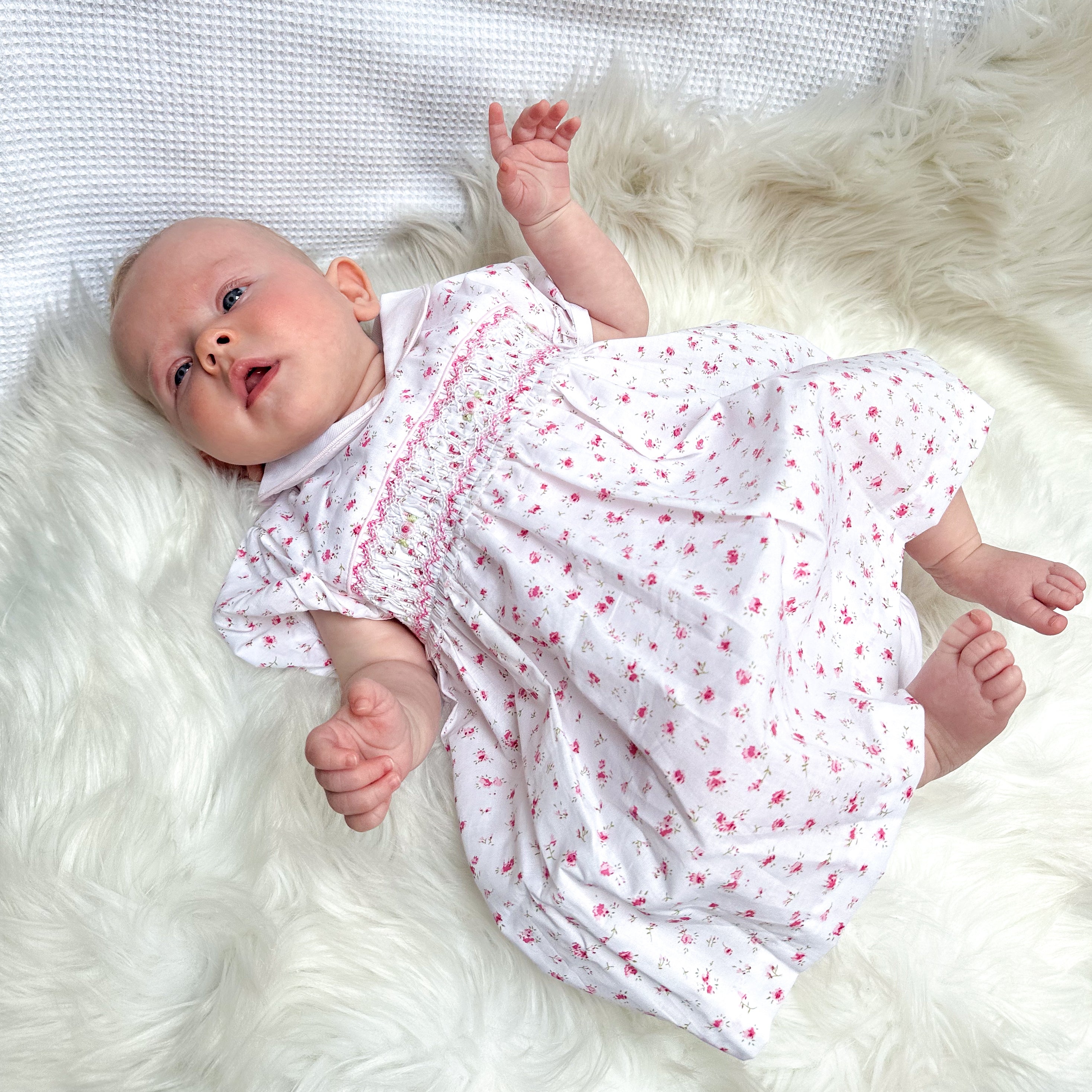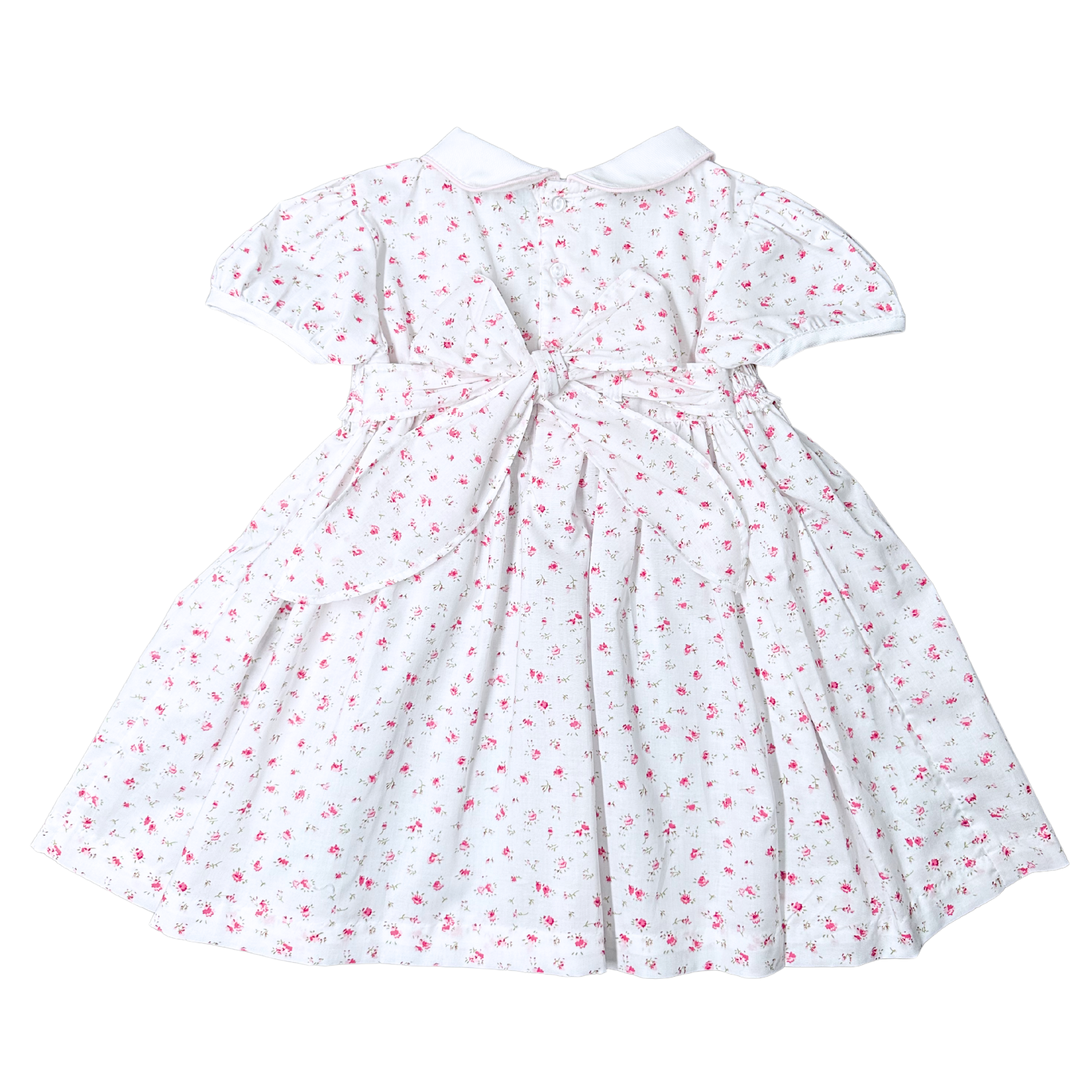 Enchanting girls smocked dress featuring a dainty pink rose print with piping on the collar and puffed sleeves. Finished with delicate hand embroidered roses across the chest and on the collar. Button fastening for easy dressing, and tie sash for a pretty bow at the back