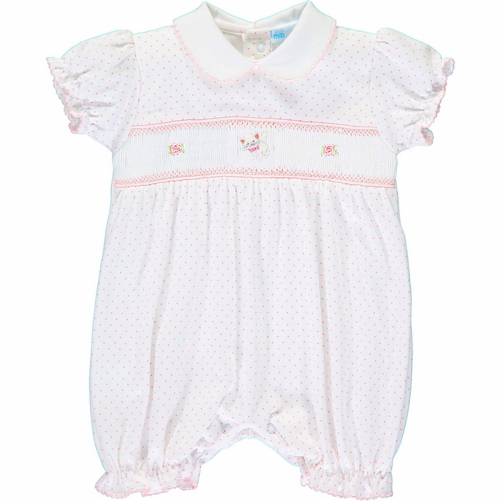 A lovely romper in our soft pima cotton with pink spots. Featuring a cute little kitten hand embroidered onto the smocked front.